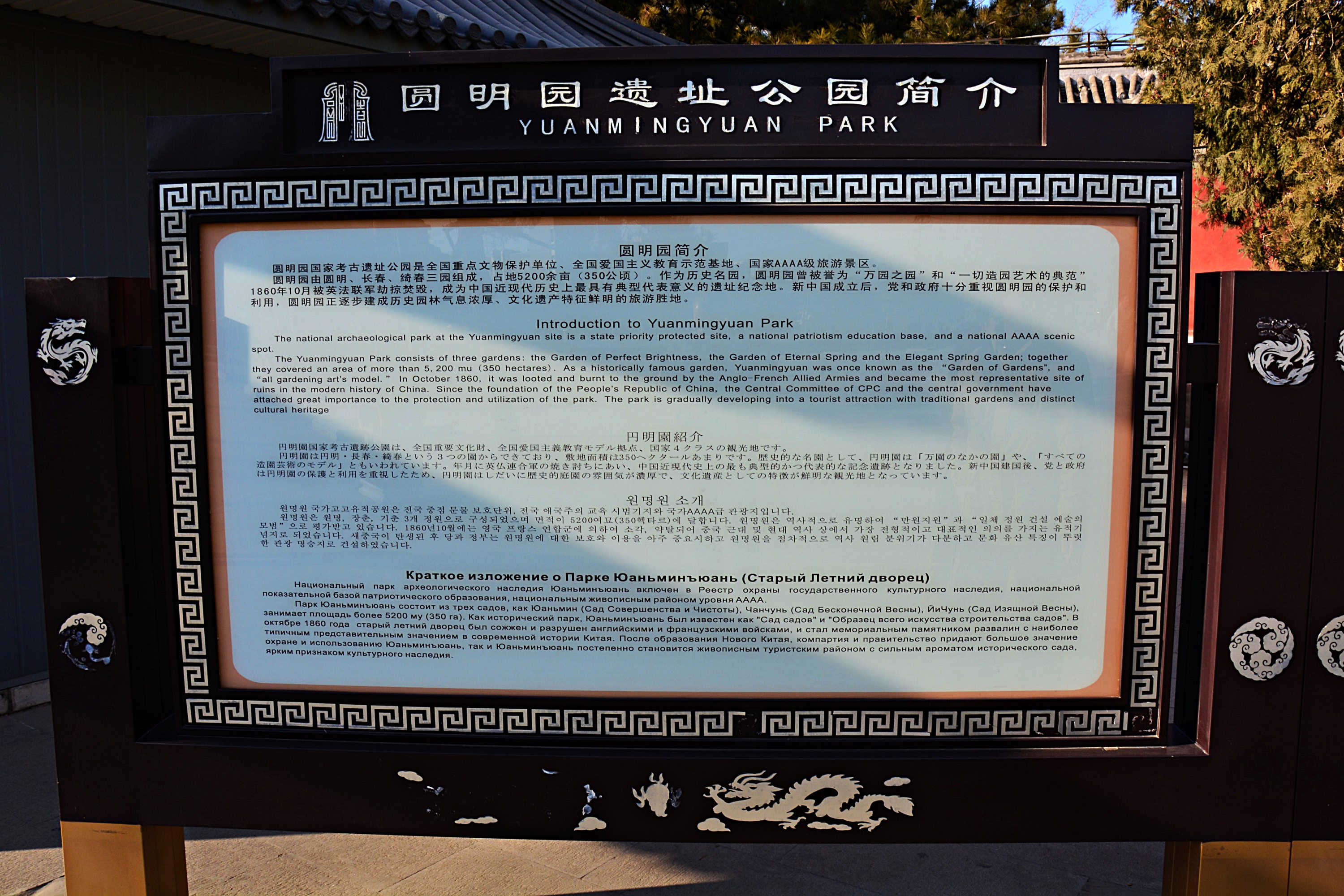 Below is a selection of photos taken during a visit to the The Old Summer Palace Yuanmingyuan on December 11, 2013. Click on a small photo for a larger view, then select the next one with the cursor keys or the arrows on either side of the photo.